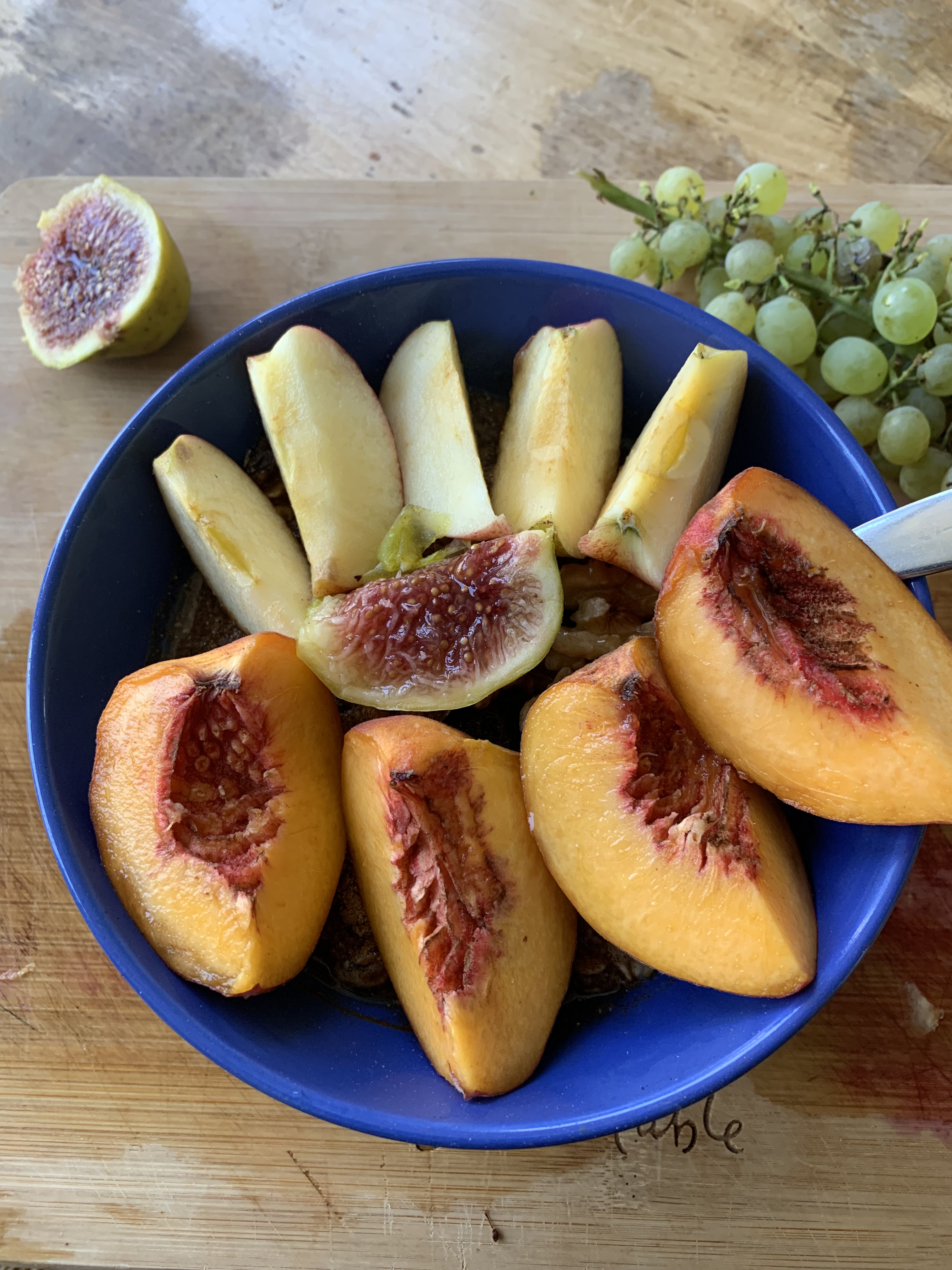 - Fruits are full of goodness: They are chock full of vitamins (A, B, C, E, to name a few) and minerals (potassium, iron, manganese, and more), which are essential to life. They are rich in fiber, which is the crucial component of the diet that feeds our microbiome and what more than 95% of Americans don’t get enough of. They have many antioxidants and phytonutrients that help deal with chronic inflammation and decrease our risk of baddies like cancer (more of that below). And they are a source of nature-filtered water to keep us hydrated on these hot days. Oh, yeah, they also taste amazing and are great to eat for every meal of the day: before a meal (which actually leads to fewer calories consumed during the meal), incorporated into the meal like the fruit on my oatmeal above, or just as a simple dessert.